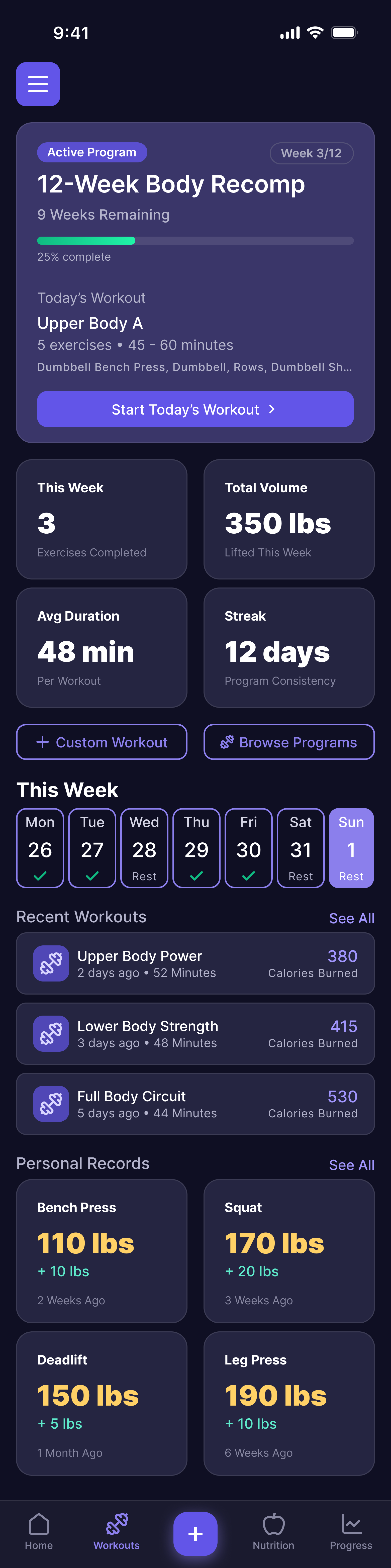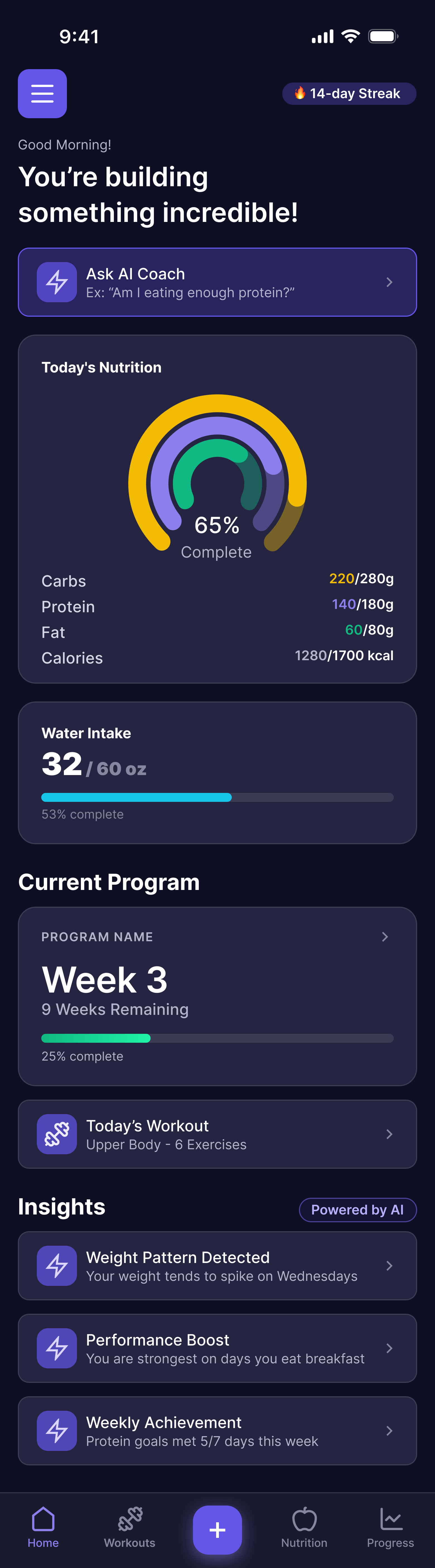 Workout programming. Nutrition tracking. AI coaching. All in one place — built for people who want to see results.